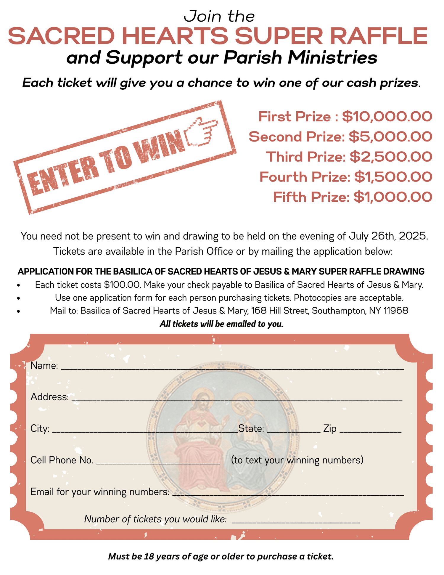 Annual super raffle ticket supporting Parish Ministries. Enter for a chance to win one of our cash prizes.